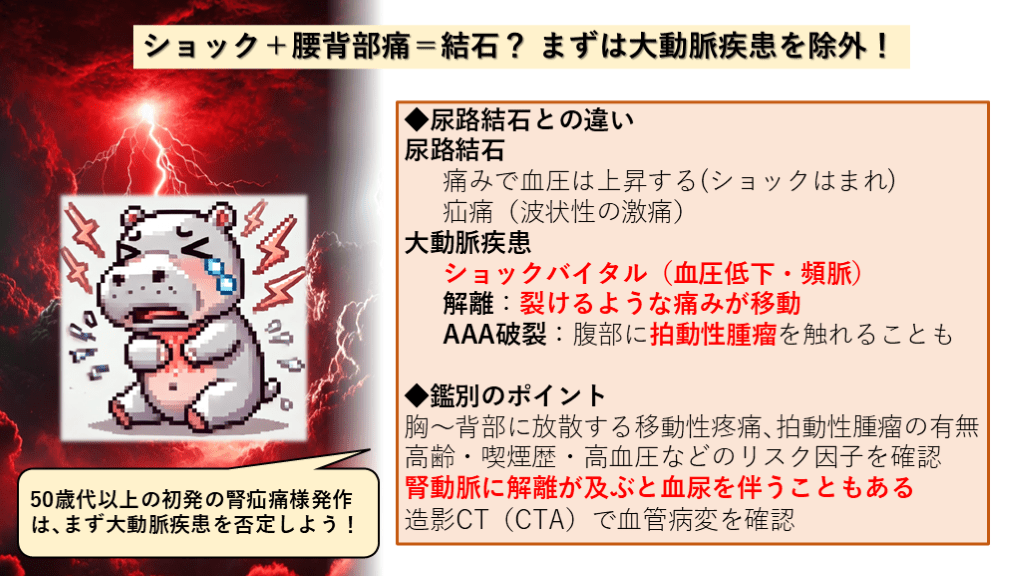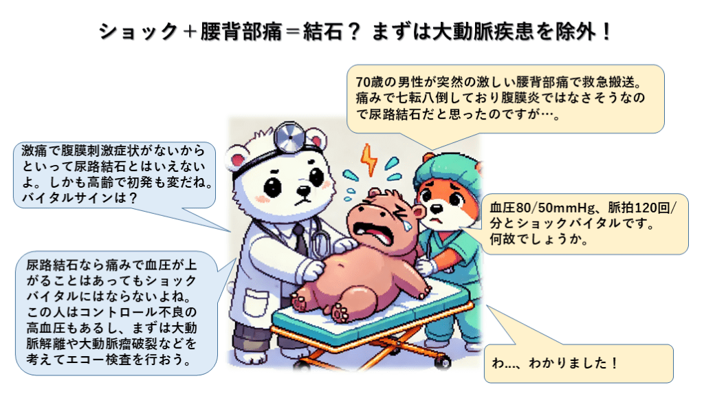 #19. 激痛で腹膜刺激症状がないからといって尿路結石とはいえないよ。しかも高齢で初発も変だね。バイタルサインは? 70歳の男性が突然の激しい腰背部痛で救急搬送。痛みで七転八倒しており腹膜炎ではなさそうなので尿路結石だと思ったのですが…。 ショック+腰背部痛=結石? まずは大動脈疾患を除外! 血圧80/50mmHg、脈拍120回/分とショックバイタルです。