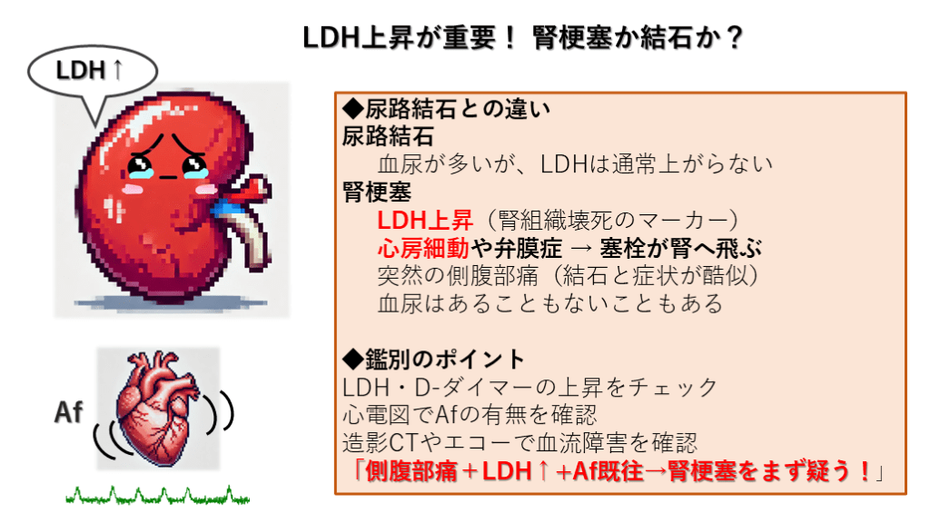 「側腹部痛+LDH↑+Af既往→腎梗塞をまず疑う!」 LDH↑ Af