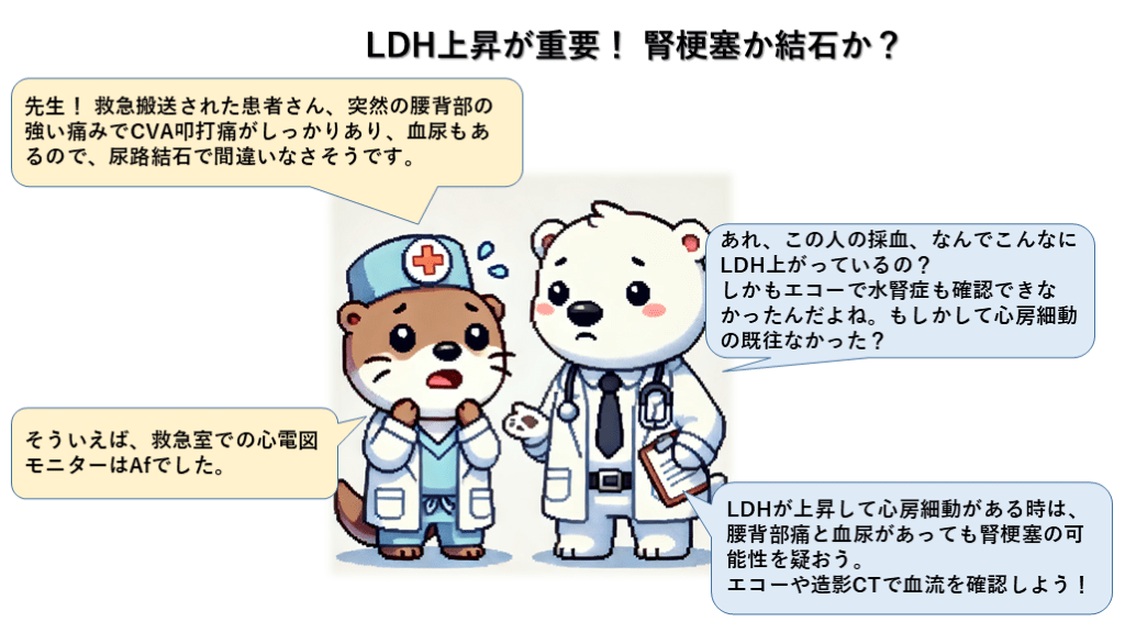 しかもエコーで水腎症も確認できなかったんだよね。もしかして心房細動の既往なかった? 先生! 救急搬送された患者さん、突然の腰背部の強い痛みでCVA叩打痛がしっかりあり、血尿もあるので、尿路結石で間違いなさそうです。 そういえば、救急室での心電図モニターはAfでした。 LDHが上昇して心房細動がある時は、腰背部痛と血尿があっても腎梗塞の可能性を疑おう。
