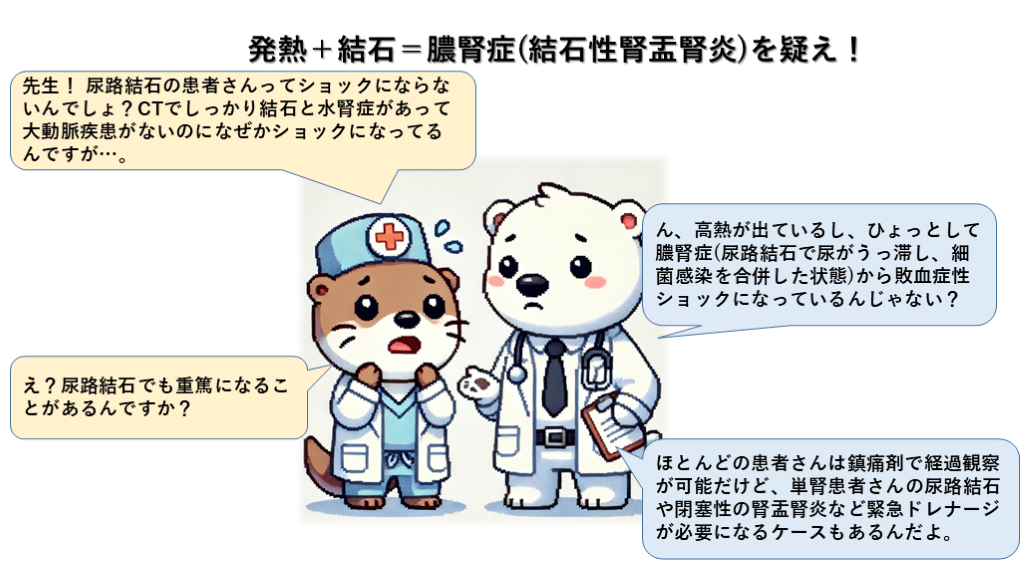 大動脈疾患がないのになぜかショックになってるんですが…。 え?尿路結石でも重篤になることがあるんですか? ほとんどの患者さんは鎮痛剤で経過観察が可能だけど、単腎患者さんの尿路結石や閉塞性の腎盂腎炎など緊急ドレナージが必要になるケースもあるんだよ。 発熱+結石=膿腎症(結石性腎盂腎炎)を疑え!