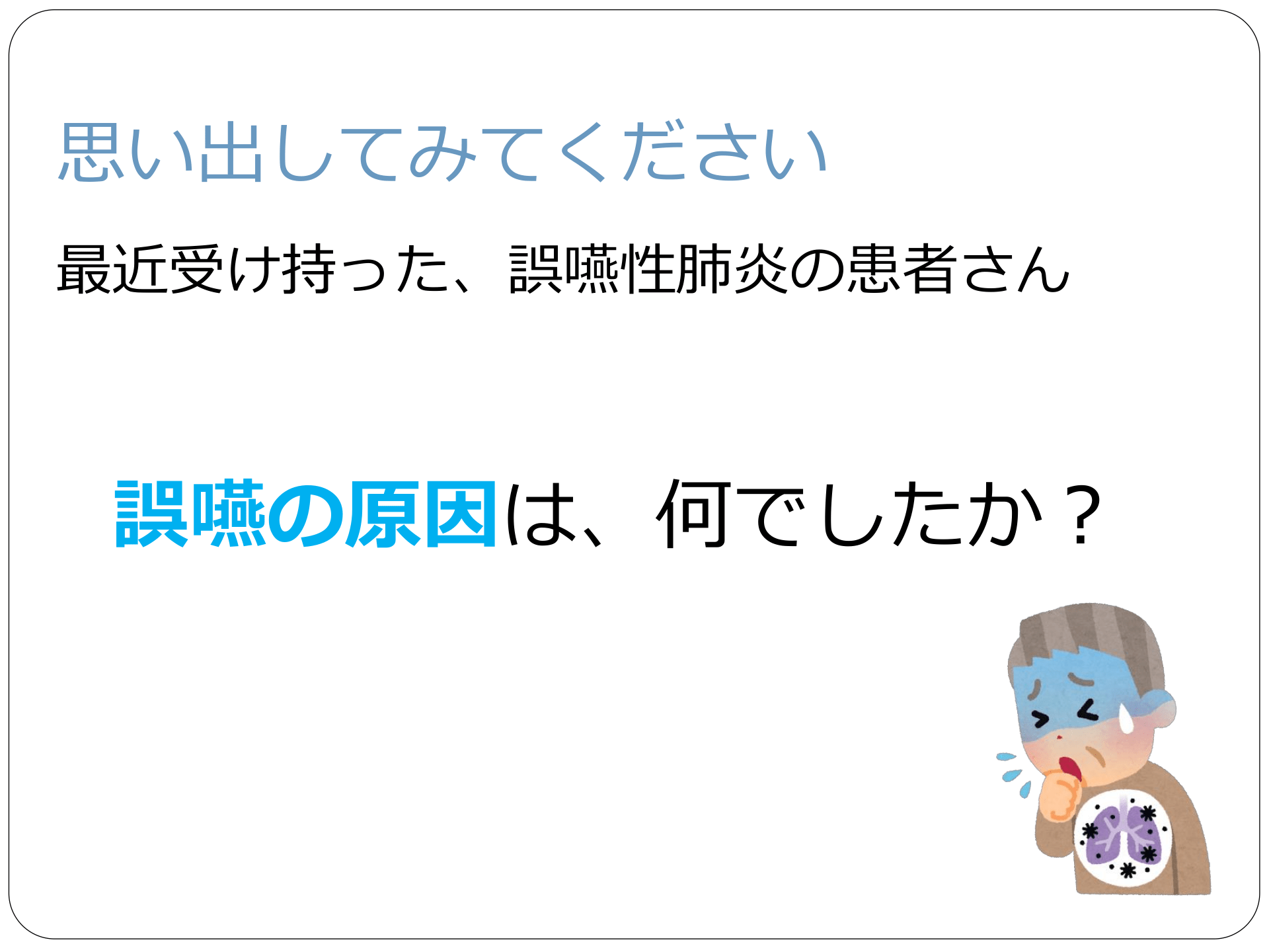 最近受け持った誤嚥性肺炎の患者さん、誤嚥の原因は何でしたか?