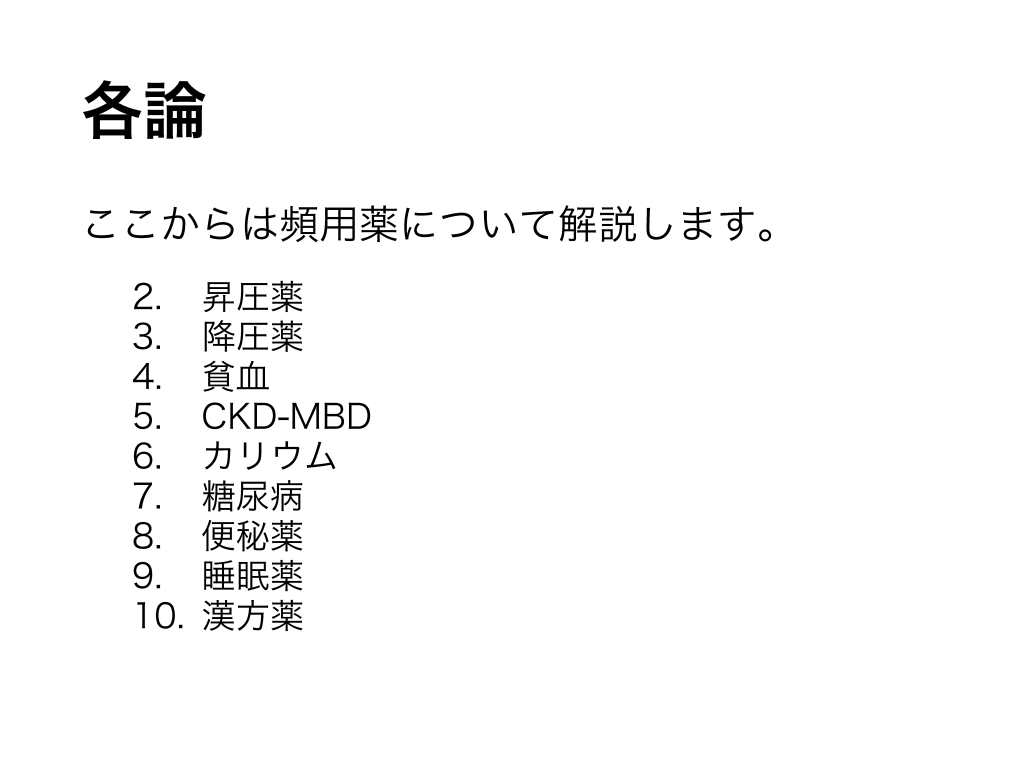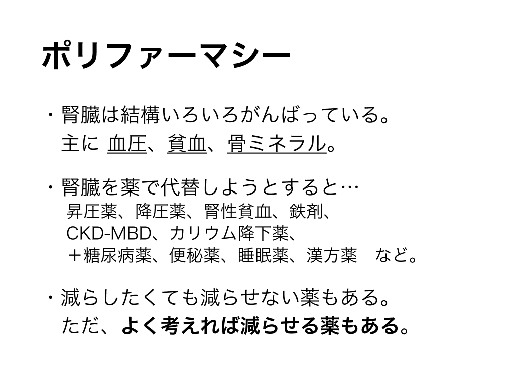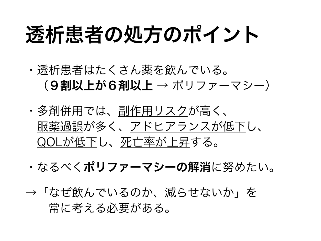 透析患者はポリファーマシーが問題になるので、なんで飲んでる薬なのか把握して、なるべく減らせたらいいよねって話です。
