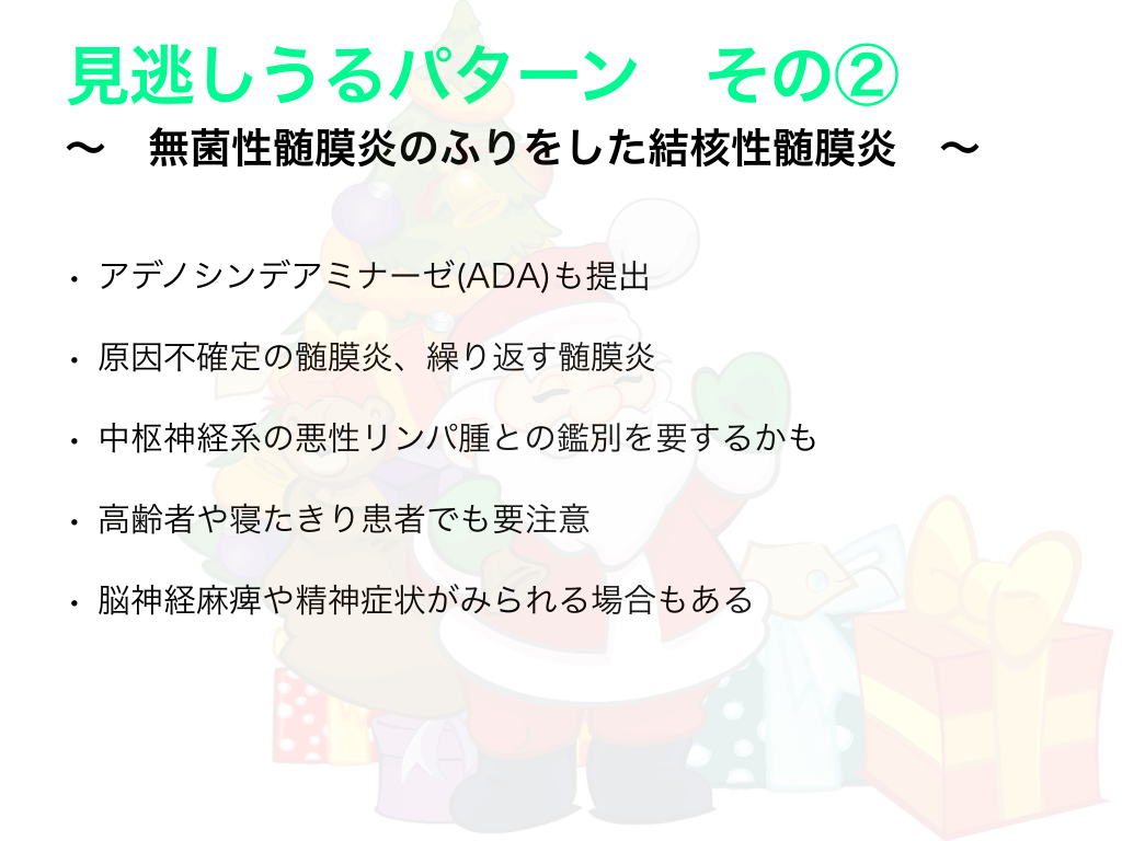 #10. 見逃しうるパターン その② 〜 無菌性髄膜炎のふりをした結核性髄膜炎 • アデノシンデアミナーゼ(ADA)も提出 • 原因不確定の髄膜炎、繰り返す髄膜炎 • 中枢神経系の悪性リンパ腫との鑑別を要するかも • 高齢者や寝たきり患者でも要注意 • 脳神経麻痺や精神症状がみられる場合もある 〜