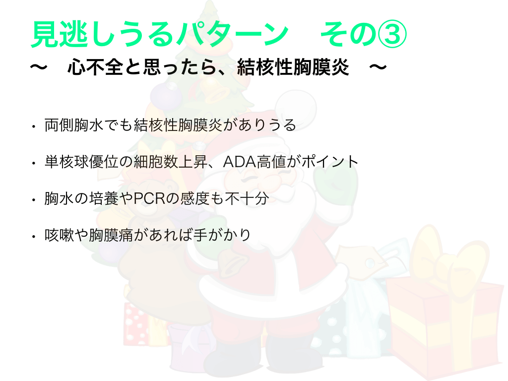 #11. 見逃しうるパターン その③ 〜 心不全と思ったら、結核性胸膜炎 • 両側胸水でも結核性胸膜炎がありうる • 単核球優位の細胞数上昇、ADA高値がポイント • 胸水の培養やPCRの感度も不十分 • 咳嗽や胸膜痛があれば手がかり 〜