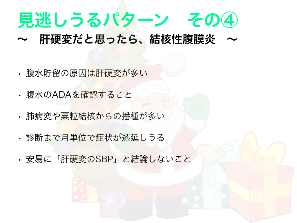 #12. 見逃しうるパターン その④ 〜 肝硬変だと思ったら、結核性腹膜炎 • 腹水貯留の原因は肝硬変が多い • 腹水のADAを確認すること • 肺病変や粟粒結核からの播種が多い • 診断まで月単位で症状が遷延しうる • 安易に「肝硬変のSBP」と結論しないこと 〜