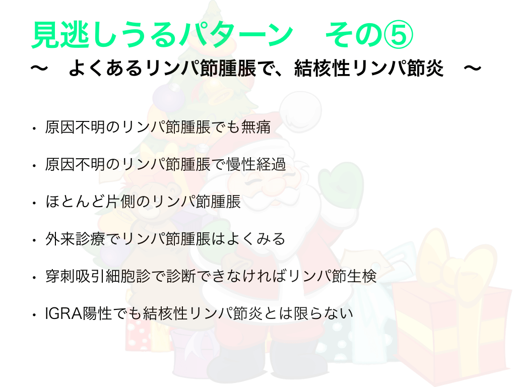 #13. 見逃しうるパターン その⑤ 〜 よくあるリンパ節腫脹で、結核性リンパ節炎 • 原因不明のリンパ節腫脹でも無痛 • 原因不明のリンパ節腫脹で慢性経過 • ほとんど片側のリンパ節腫脹 • 外来診療でリンパ節腫脹はよくみる • 穿刺吸引細胞診で診断できなければリンパ節生検 • IGRA陽性でも結核性リンパ節炎とは限らない 〜
