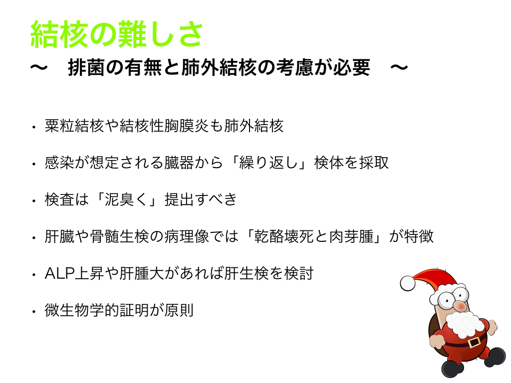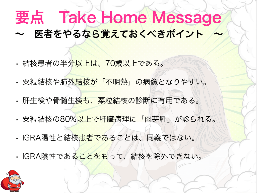 #2. 要点 Take Home Message 〜 医者をやるなら覚えておくべきポイント 〜 • 結核患者の半分以上は、70歳以上である。 • 粟粒結核や肺外結核が「不明熱」の病像となりやすい。 • 肝生検や骨髄生検も、粟粒結核の診断に有用である。 • 粟粒結核の80%以上で肝臓病理に「肉芽腫」が診られる。 • IGRA陽性と結核患者であることは、同義ではない。 • IGRA陰性であることをもって、結核を除外できない。