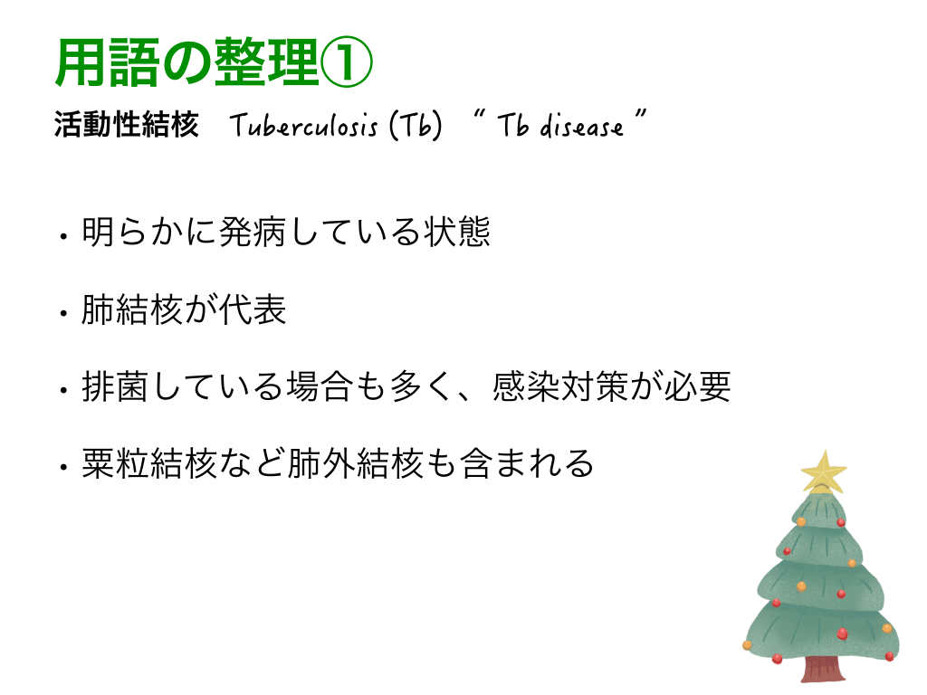 #3. 用語の整理① 活動性結核 Tuberculosis (Tb) “ Tb disease ” • 明らかに発病している状態 • 肺結核が代表 • 排菌している場合も多く、感染対策が必要 • 粟粒結核など肺外結核も含まれる