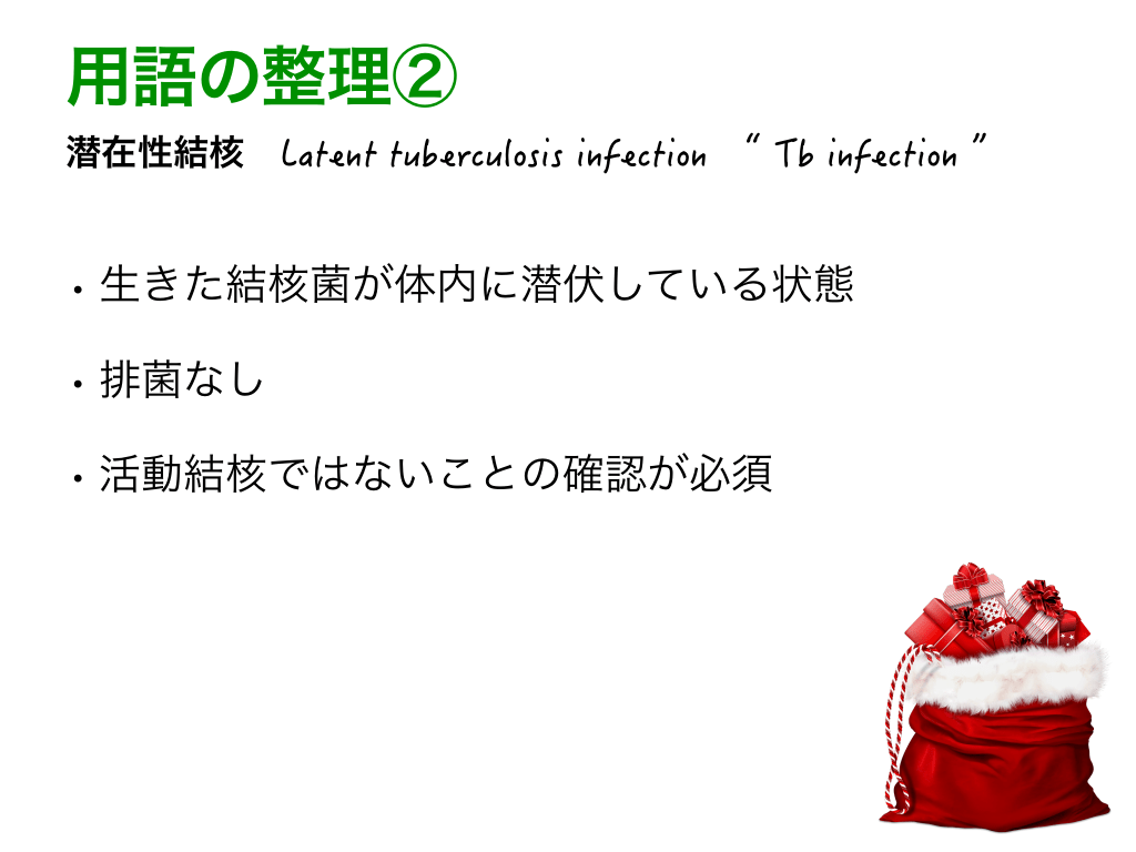 #4. 用語の整理② 潜在性結核 Latent tuberculosis infection “ Tb infection ” • 生きた結核菌が体内に潜伏している状態 • 排菌なし • 活動結核ではないことの確認が必須