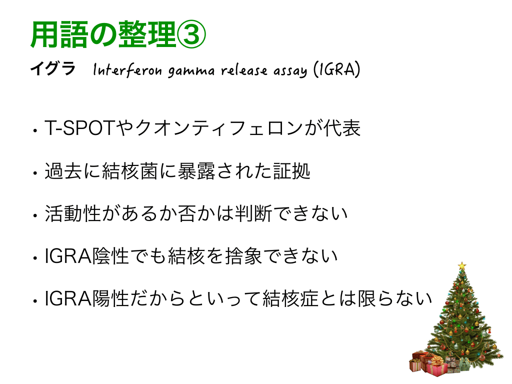 #5. 用語の整理③ イグラ Interferon gamma release assay (IGRA) • T-SPOTやクオンティフェロンが代表 • 過去に結核菌に暴露された証拠 • 活動性があるか否かは判断できない • IGRA陰性でも結核を捨象できない • IGRA陽性だからといって結核症とは限らない