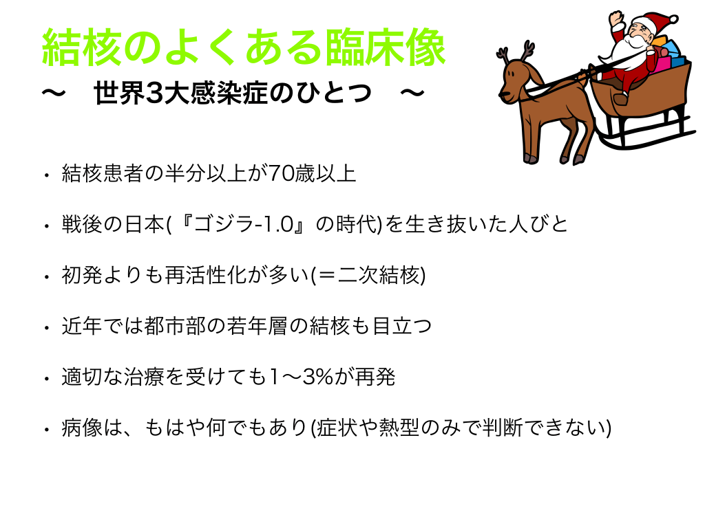 #6. 結核のよくある臨床像 〜 世界3大感染症のひとつ 〜 • 結核患者の半分以上が70歳以上 • 戦後の日本(『ゴジラ-1.0』の時代)を生き抜いた人びと • 初発よりも再活性化が多い(=二次結核) • 近年では都市部の若年層の結核も目立つ • 適切な治療を受けても1〜3%が再発 • 病像は、もはや何でもあり(症状や熱型のみで判断できない)
