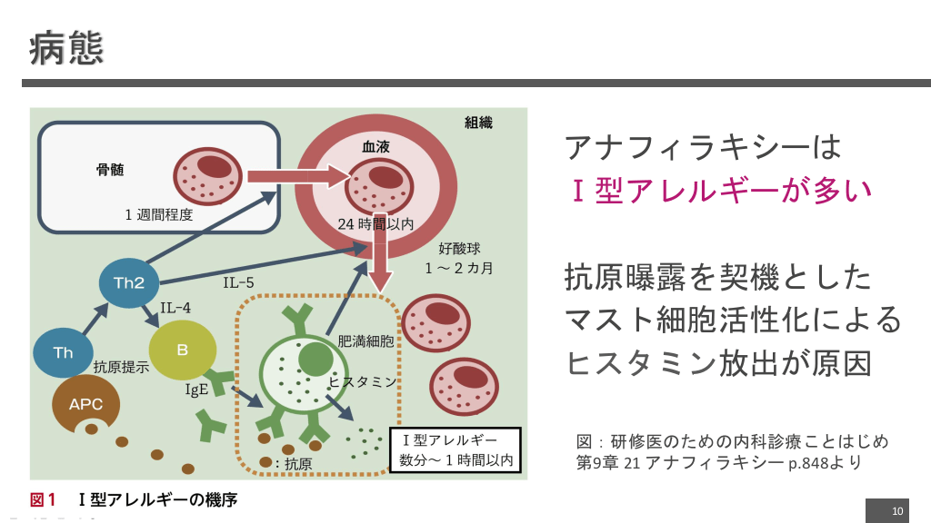 #10. 病態 アナフィラキシーは Ⅰ型アレルギーが多い 抗原曝露を契機とした マスト細胞活性化による ヒスタミン放出が原因 図:研修医のための内科診療ことはじめ 第9章 21 アナフィラキシー p.848より 10