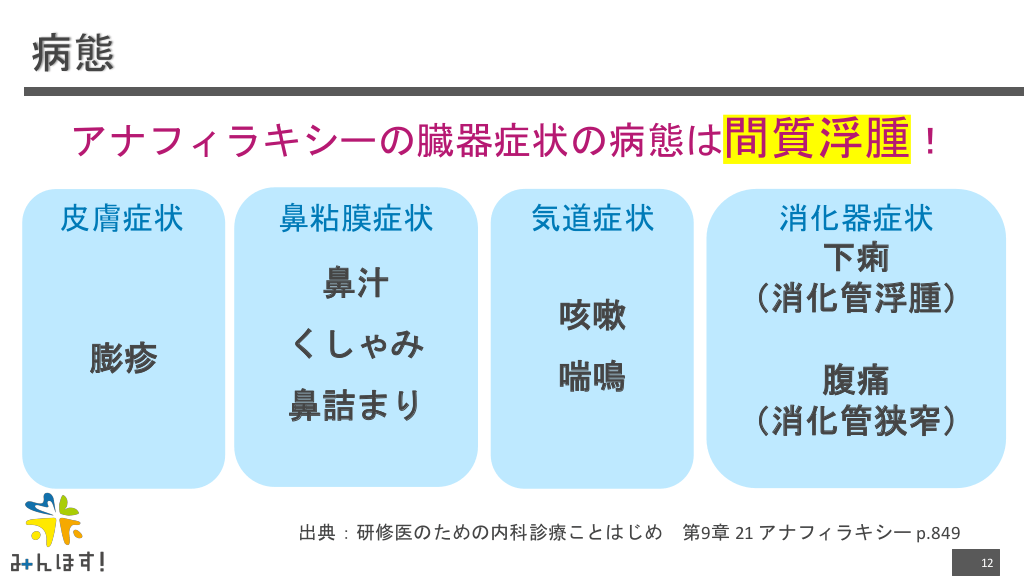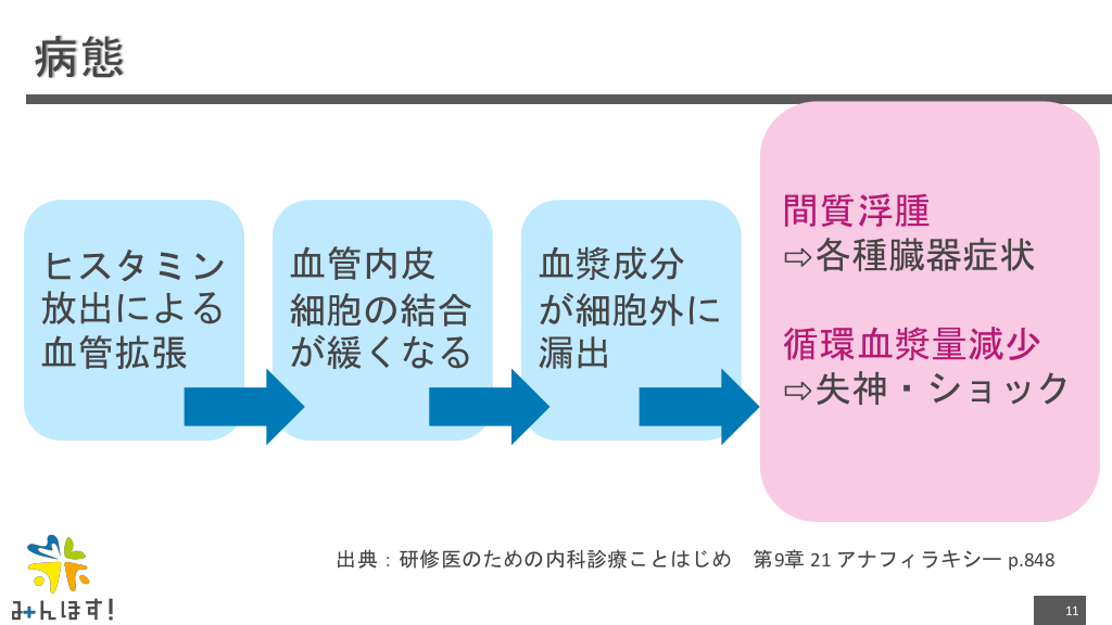 #11. 病態 ヒスタミン 放出による 血管拡張 血管内皮 細胞の結合 が緩くなる 血漿成分 が細胞外に 漏出 間質浮腫 ⇨各種臓器症状 循環血漿量減少 ⇨失神・ショック 出典:研修医のための内科診療ことはじめ 第9章 21 アナフィラキシー p.848 11