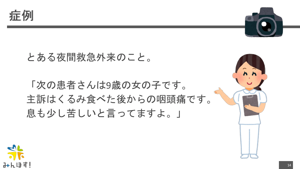 #14. 症例 とある夜間救急外来のこと。 「次の患者さんは9歳の女の子です。 主訴はくるみ食べた後からの咽頭痛です。 息も少し苦しいと言ってますよ。」 14