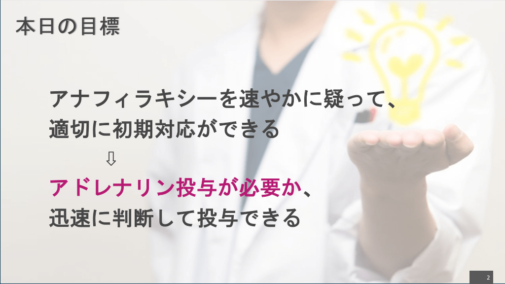 #2. 本日の目標 アナフィラキシーを速やかに疑って、 適切に初期対応ができる ⇩ アドレナリン投与が必要か、 迅速に判断して投与できる 2