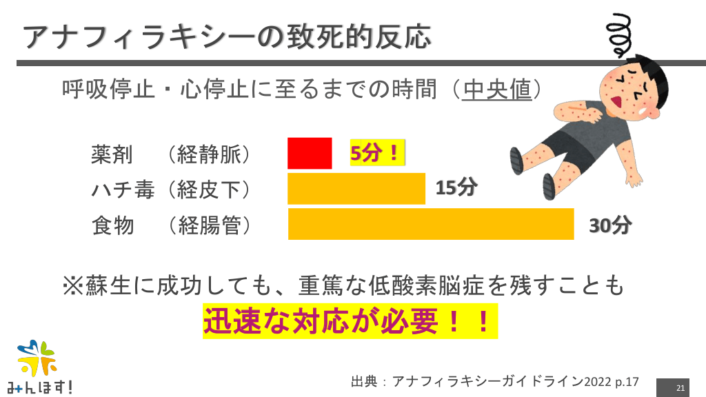 #21. アナフィラキシーの致死的反応 呼吸停止・心停止に至るまでの時間(中央値) 薬剤 (経静脈) ハチ毒(経皮下) 5分! 15分 食物 (経腸管) 30分 ※蘇生に成功しても、重篤な低酸素脳症を残すことも 迅速な対応が必要!! 出典:アナフィラキシーガイドライン2022 p.17 21