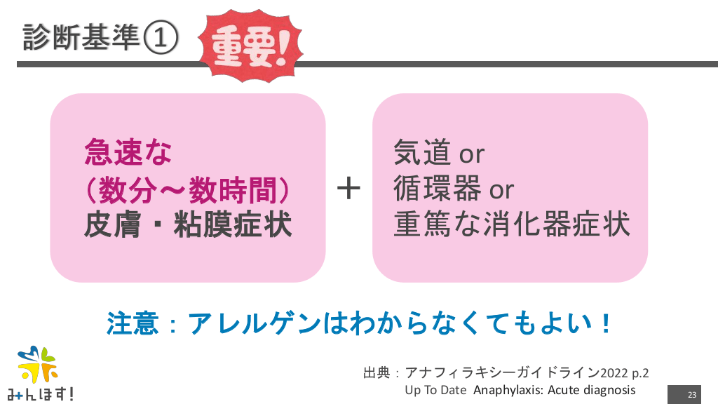 #23. 診断基準① 急速な 気道 or (数分〜数時間) + 循環器 or + 皮膚・粘膜症状 重篤な消化器症状 注意:アレルゲンはわからなくてもよい! 出典:アナフィラキシーガイドライン2022 p.2 Up To Date Anaphylaxis: Acute diagnosis 23
