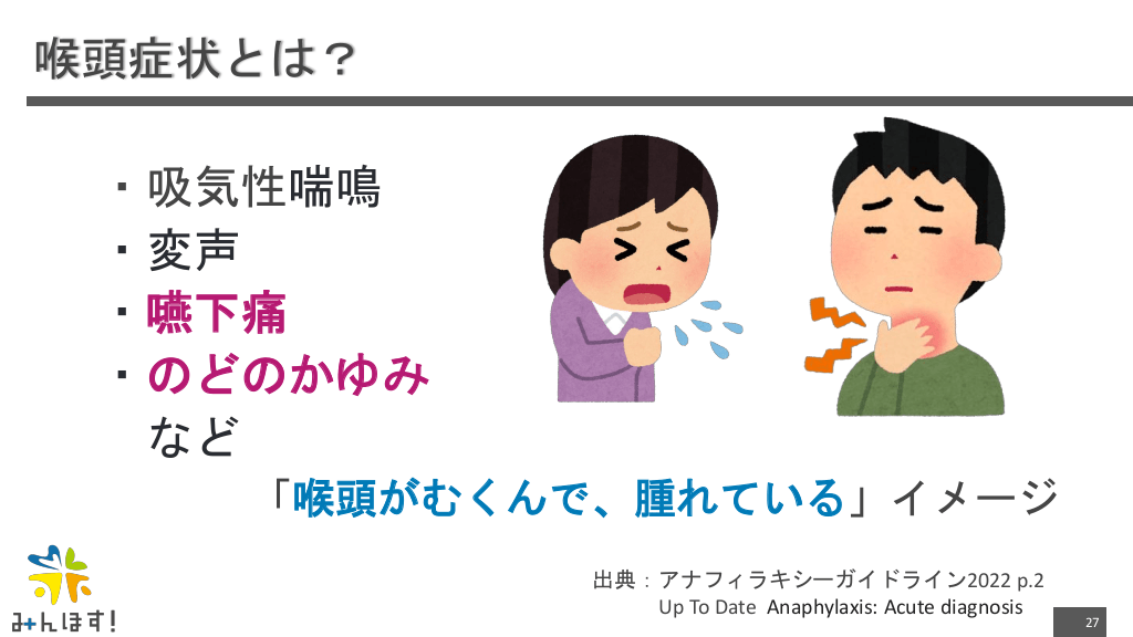 #27. 喉頭症状とは? ・吸気性喘鳴 ・変声 ・嚥下痛 ・のどのかゆみ など 「喉頭がむくんで、腫れている」イメージ 出典:アナフィラキシーガイドライン2022 p.2 Up To Date Anaphylaxis: Acute diagnosis 27