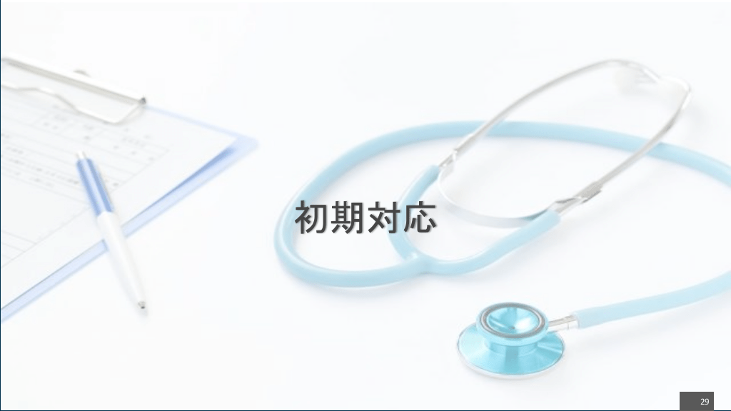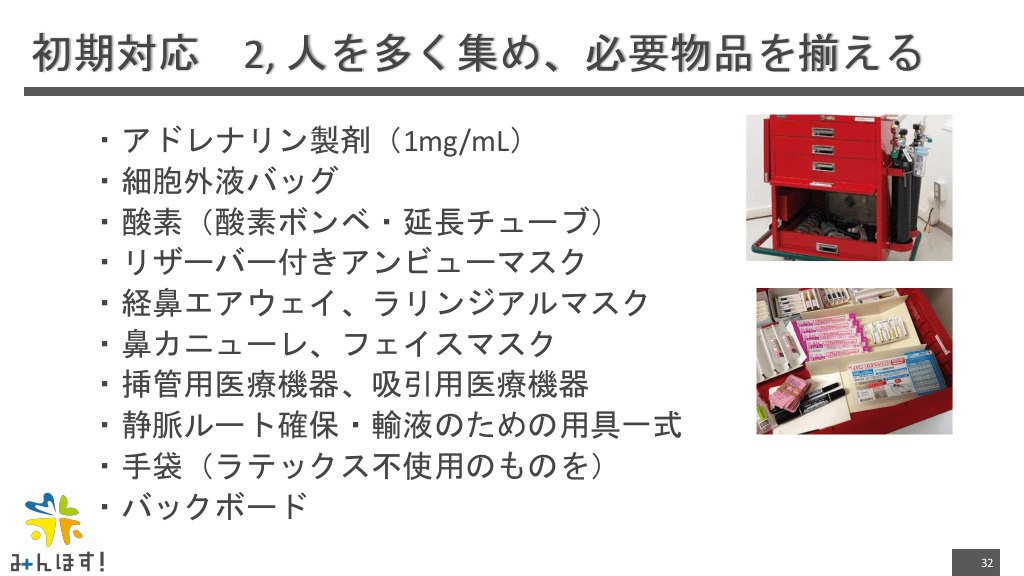 #32. 初期対応 2, 人を多く集め、必要物品を揃える ・アドレナリン製剤(1mg/mL) ・細胞外液バッグ ・酸素(酸素ボンベ・延長チューブ) ・リザーバー付きアンビューマスク ・経鼻エアウェイ、ラリンジアルマスク ・鼻カニューレ、フェイスマスク ・挿管用医療機器、吸引用医療機器 ・静脈ルート確保・輸液のための用具一式 ・手袋(ラテックス不使用のものを) ・バックボード 32