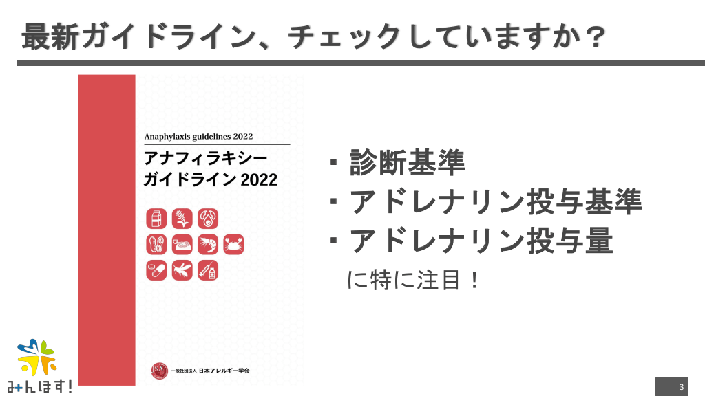 #3. 最新ガイドライン、チェックしていますか? ・診断基準 ・アドレナリン投与基準 ・アドレナリン投与量 に特に注目! 3