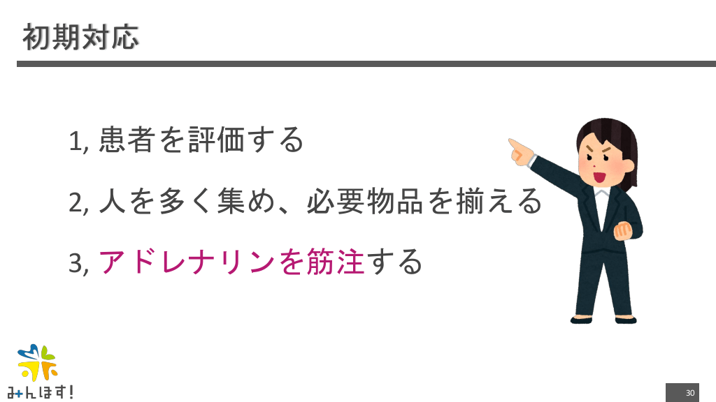 #30. 初期対応 1, 患者を評価する 2, 人を多く集め、必要物品を揃える 3, アドレナリンを筋注する 30