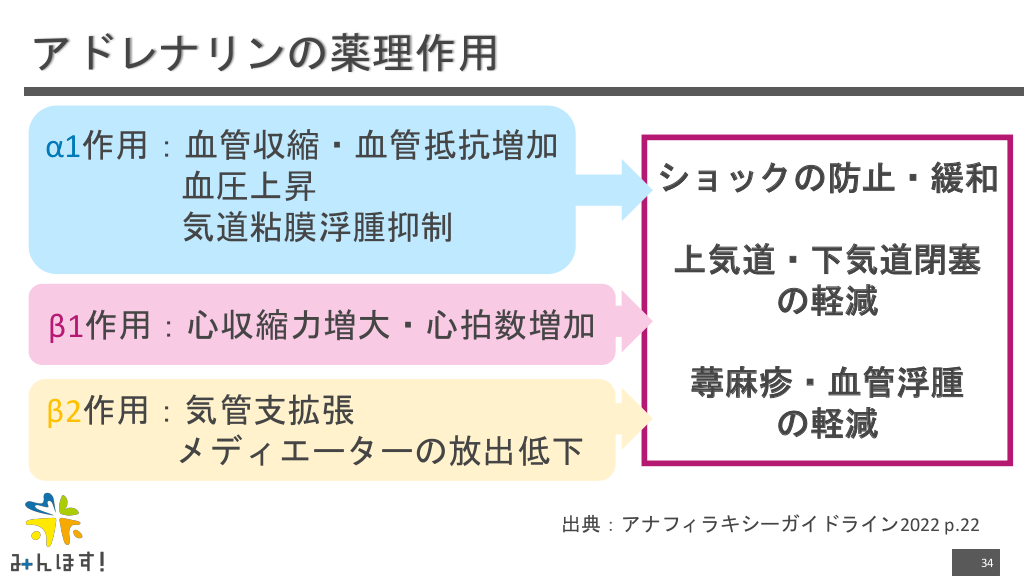 #34. アドレナリンの薬理作用 α1作用:血管収縮・血管抵抗増加 血圧上昇 気道粘膜浮腫抑制 ショックの防止・緩和 β1作用:心収縮力増大・心拍数増加 β2作用:気管支拡張 メディエーターの放出低下 上気道・下気道閉塞 の軽減 蕁麻疹・血管浮腫 の軽減 出典:アナフィラキシーガイドライン2022 p.22 34
