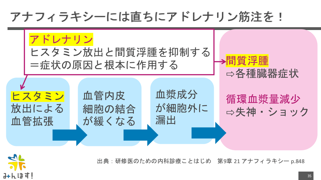 #35. アナフィラキシーには直ちにアドレナリン筋注を! アドレナリン ヒスタミン放出と間質浮腫を抑制する =症状の原因と根本に作用する ヒスタミン 放出による 血管拡張 血管内皮 細胞の結合 が緩くなる 血漿成分 が細胞外に 漏出 間質浮腫 ⇨各種臓器症状 循環血漿量減少 ⇨失神・ショック 出典:研修医のための内科診療ことはじめ 第9章 21 アナフィラキシー p.848 35
