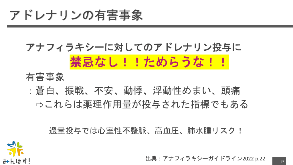#37. アドレナリンの有害事象 アナフィラキシーに対してのアドレナリン投与に 禁忌なし!!ためらうな!! 有害事象 :蒼白、振戦、不安、動悸、浮動性めまい、頭痛 ⇨これらは薬理作用量が投与された指標でもある 過量投与では心室性不整脈、高血圧、肺水腫リスク! 出典:アナフィラキシーガイドライン2022 p.22 37