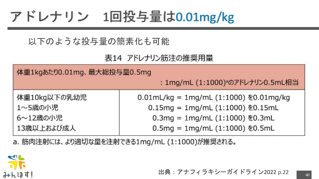 #40. アドレナリン 1回投与量は0.01mg/kg 以下のような投与量の簡素化も可能 出典:アナフィラキシーガイドライン2022 p.22 40