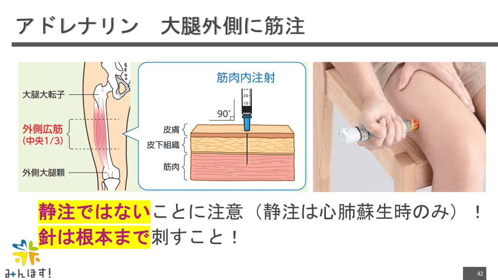 #42. アドレナリン 大腿外側に筋注 静注ではないことに注意(静注は心肺蘇生時のみ)! 針は根本まで刺すこと! 42