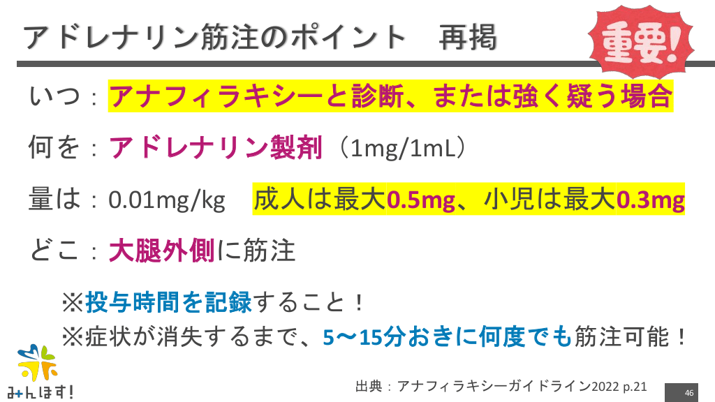 #46. アドレナリン筋注のポイント 再掲 いつ:アナフィラキシーと診断、または強く疑う場合 何を:アドレナリン製剤(1mg/1mL) 量は:0.01mg/kg 成人は最大0.5mg、小児は最大0.3mg どこ:大腿外側に筋注 ※投与時間を記録すること! ※症状が消失するまで、5〜15分おきに何度でも筋注可能! 出典:アナフィラキシーガイドライン2022 p.21 46