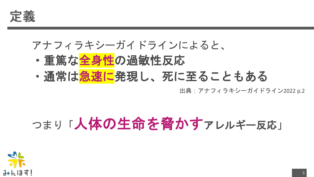 #5. 定義 アナフィラキシーガイドラインによると、 ・重篤な全身性の過敏性反応 ・通常は急速に発現し、死に至ることもある 出典:アナフィラキシーガイドライン2022 p.2 つまり「人体の生命を脅かすアレルギー反応」 5