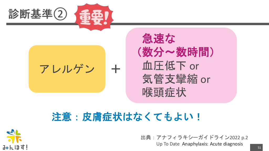 #51. 診断基準② アレルゲン 急速な (数分〜数時間) 血圧低下 or + 気管支攣縮 or 喉頭症状 注意:皮膚症状はなくてもよい! 出典:アナフィラキシーガイドライン2022 p.2 Up To Date Anaphylaxis: Acute diagnosis 51