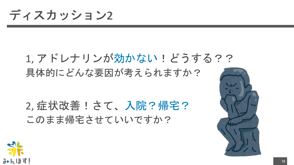 #58. ディスカッション2 1, アドレナリンが効かない!どうする?? 具体的にどんな要因が考えられますか? 2, 症状改善!さて、入院?帰宅? このまま帰宅させていいですか? 58