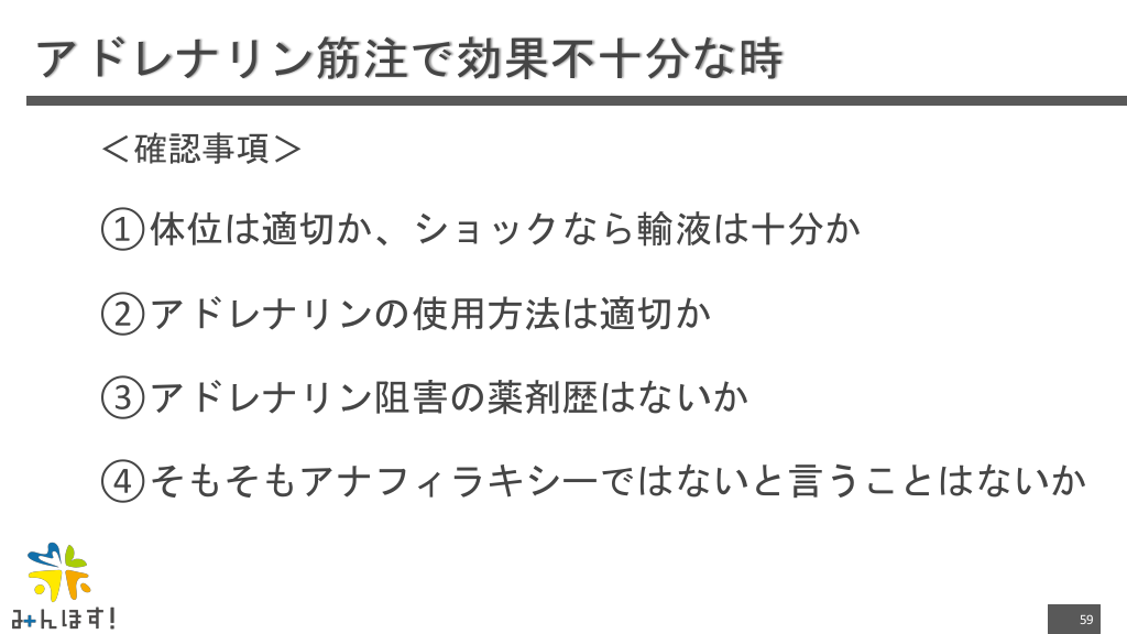 #59. アドレナリン筋注で効果不十分な時 <確認事項> ①体位は適切か、ショックなら輸液は十分か ②アドレナリンの使用方法は適切か ③アドレナリン阻害の薬剤歴はないか ④そもそもアナフィラキシーではないと言うことはないか 59