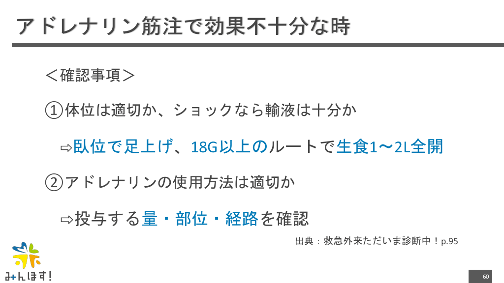#60. アドレナリン筋注で効果不十分な時 <確認事項> ①体位は適切か、ショックなら輸液は十分か ⇨臥位で足上げ、18G以上のルートで生食1〜2L全開 ②アドレナリンの使用方法は適切か ⇨投与する量・部位・経路を確認 出典:救急外来ただいま診断中!p.95 60