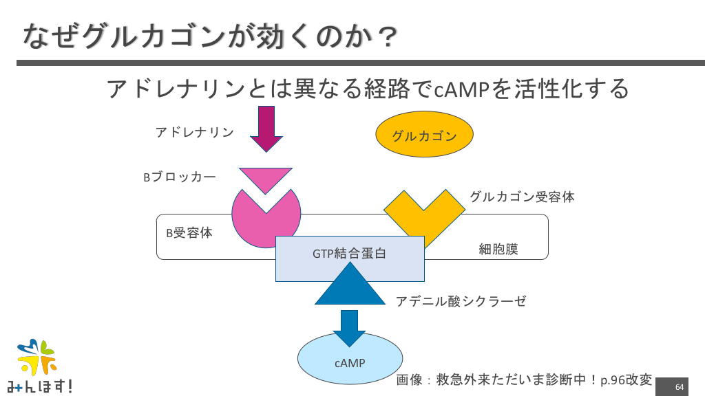 #64. なぜグルカゴンが効くのか? アドレナリンとは異なる経路でcAMPを活性化する アドレナリン グルカゴン Βブロッカー グルカゴン受容体 Β受容体 GTP結合蛋白 細胞膜 アデニル酸シクラーゼ cAMP 画像:救急外来ただいま診断中!p.96改変 64