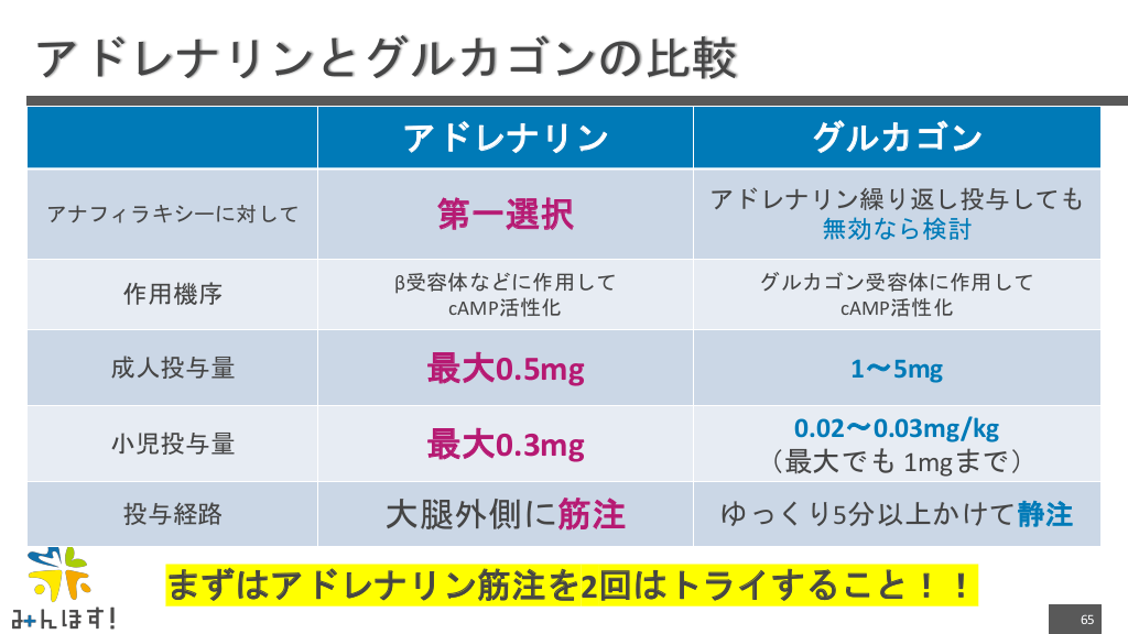 #65. アドレナリンとグルカゴンの比較 アドレナリン グルカゴン アナフィラキシーに対して 第一選択 アドレナリン繰り返し投与しても 無効なら検討 作用機序 β受容体などに作用して cAMP活性化 グルカゴン受容体に作用して cAMP活性化 成人投与量 最大0.5mg 1〜5mg 小児投与量 最大0.3mg 0.02〜0.03mg/kg (最大でも 1mgまで) 投与経路 大腿外側に筋注 ゆっくり5分以上かけて静注 まずはアドレナリン筋注を2回はトライすること!! 65