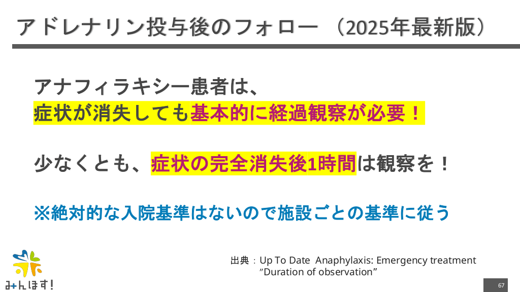 #67. アドレナリン投与後のフォロー (2025年最新版) アナフィラキシー患者は、 症状が消失しても基本的に経過観察が必要! 少なくとも、症状の完全消失後1時間は観察を! ※絶対的な入院基準はないので施設ごとの基準に従う 出典:Up To Date Anaphylaxis: Emergency treatment ”Duration of observation” 67