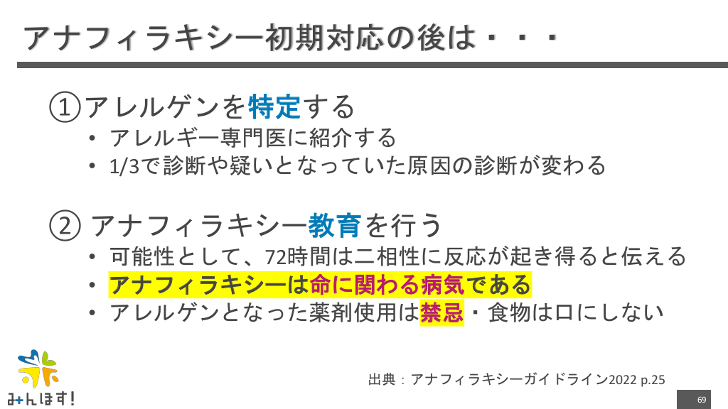 #69. アナフィラキシー初期対応の後は・・・ ①アレルゲンを特定する • アレルギー専門医に紹介する • 1/3で診断や疑いとなっていた原因の診断が変わる ② アナフィラキシー教育を行う • 可能性として、72時間は二相性に反応が起き得ると伝える • アナフィラキシーは命に関わる病気である • アレルゲンとなった薬剤使用は禁忌・食物は口にしない 出典:アナフィラキシーガイドライン2022 p.25 69