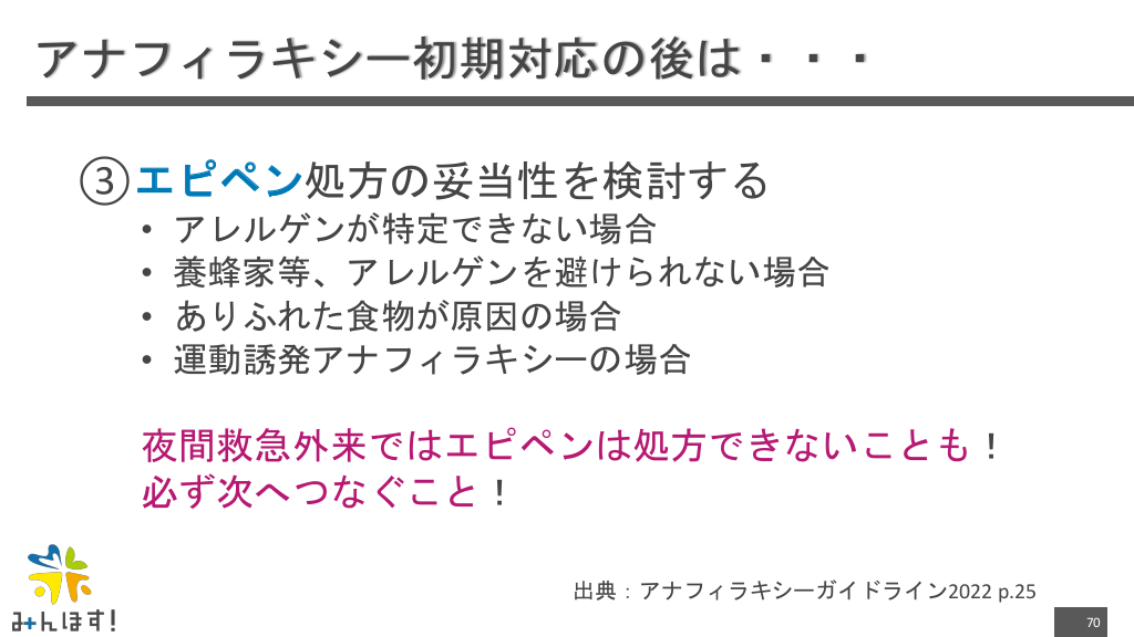 #70. アナフィラキシー初期対応の後は・・・ ③エピペン処方の妥当性を検討する • • • • アレルゲンが特定できない場合 養蜂家等、アレルゲンを避けられない場合 ありふれた食物が原因の場合 運動誘発アナフィラキシーの場合 夜間救急外来ではエピペンは処方できないことも! 必ず次へつなぐこと! 出典:アナフィラキシーガイドライン2022 p.25 70