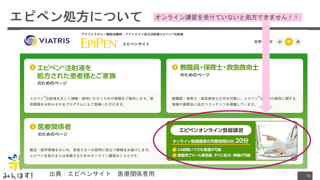 #71. エピペン処方について 出典:エピペンサイト 医療関係者用 オンライン講習を受けていないと処方できません!! 71