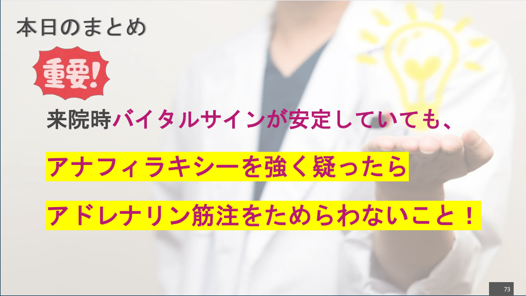 #73. 本日のまとめ 来院時バイタルサインが安定していても、 アナフィラキシーを強く疑ったら アドレナリン筋注をためらわないこと! 73