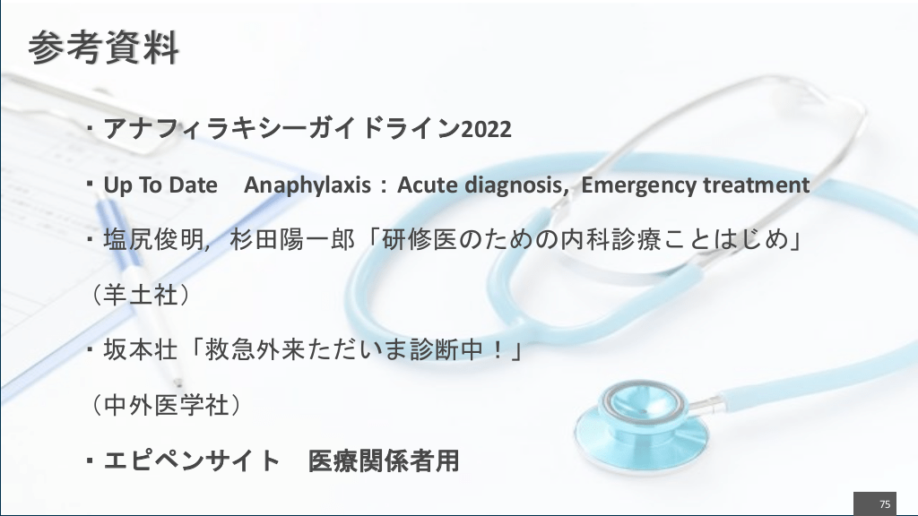 #75. 参考資料 ・アナフィラキシーガイドライン2022 ・Up To Date Anaphylaxis:Acute diagnosis, Emergency treatment ・塩尻俊明, 杉田陽一郎「研修医のための内科診療ことはじめ」 (羊土社) ・坂本壮「救急外来ただいま診断中!」 (中外医学社) ・エピペンサイト 医療関係者用 75
