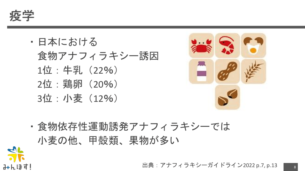 #8. 疫学 ・日本における 食物アナフィラキシー誘因 1位:牛乳(22%) 2位:鶏卵(20%) 3位:小麦(12%) ・食物依存性運動誘発アナフィラキシーでは 小麦の他、甲殻類、果物が多い 出典:アナフィラキシーガイドライン2022 p.7, p.13 8