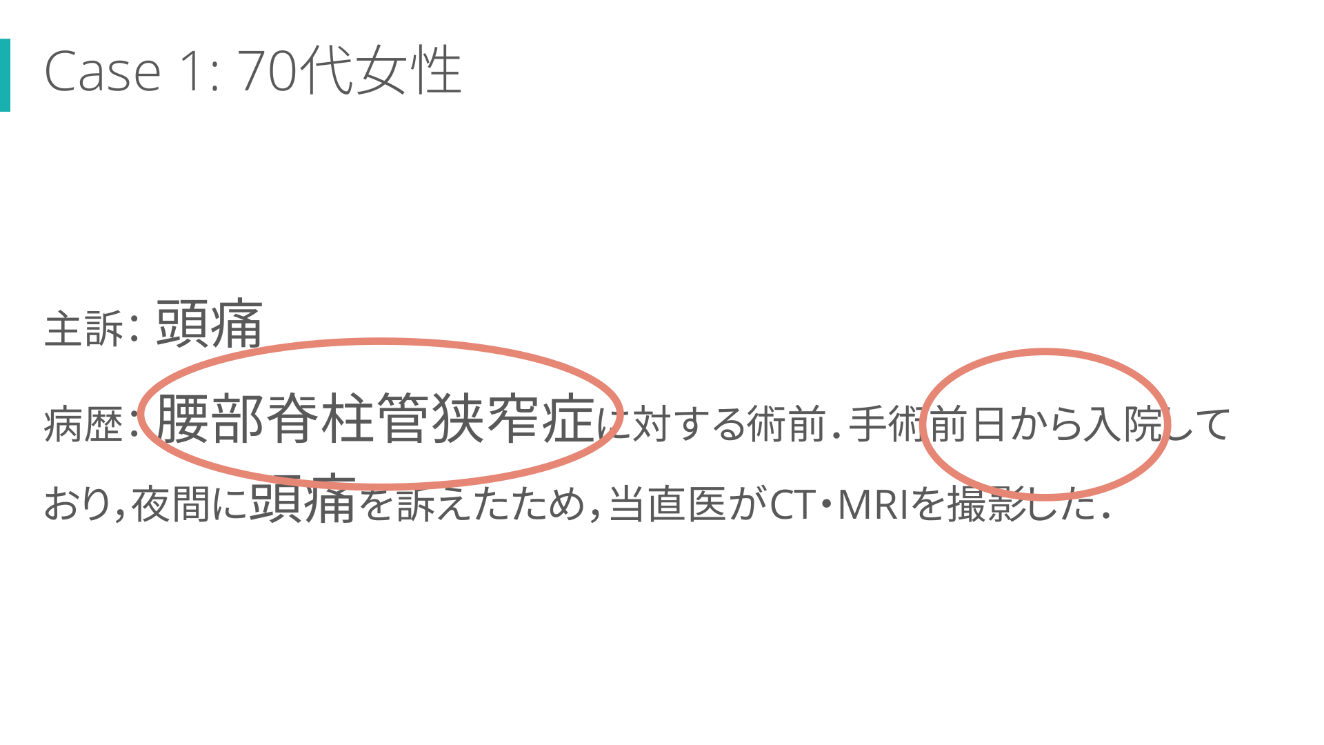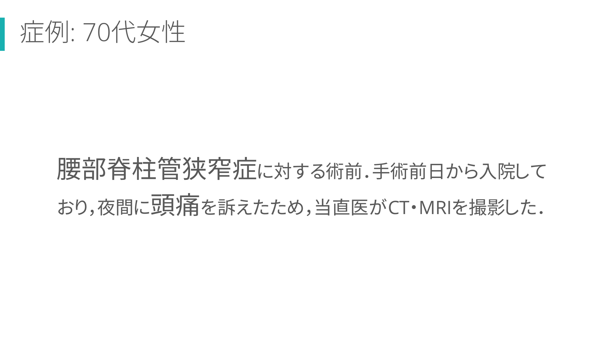 Case 1: 70代女性 主訴: 頭痛 病歴: 腰部脊柱管狭窄症に対する術前.手術前日から入院して おり,夜間に頭痛を訴えたため,当直医がCT・MRIを撮影した. #15.