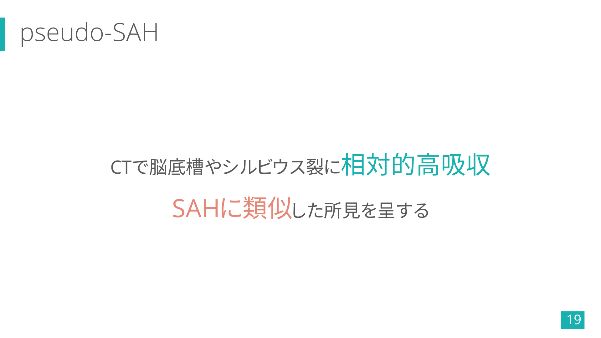 pseudo-SAH CTで脳底槽やシルビウス裂に相対的高吸収 SAHに類似した所見を呈する 19 #20.