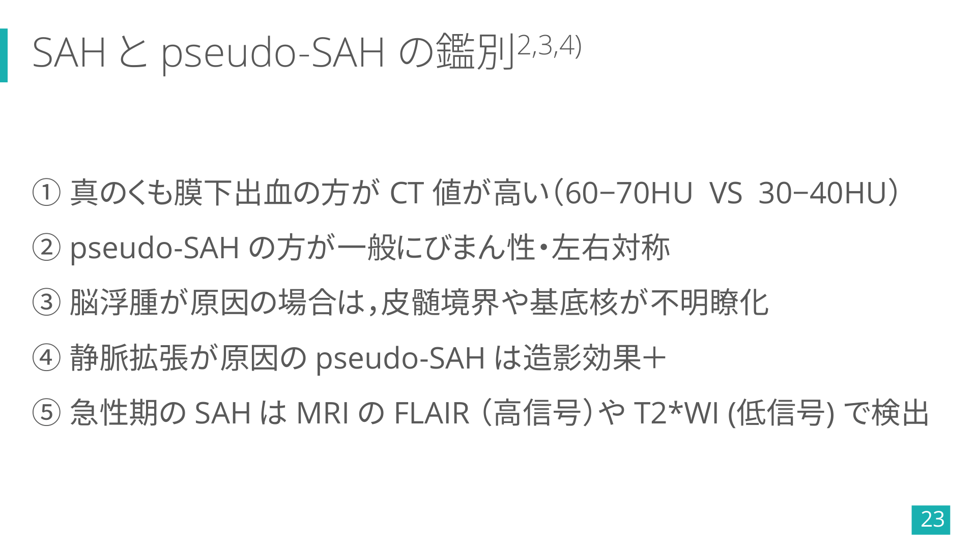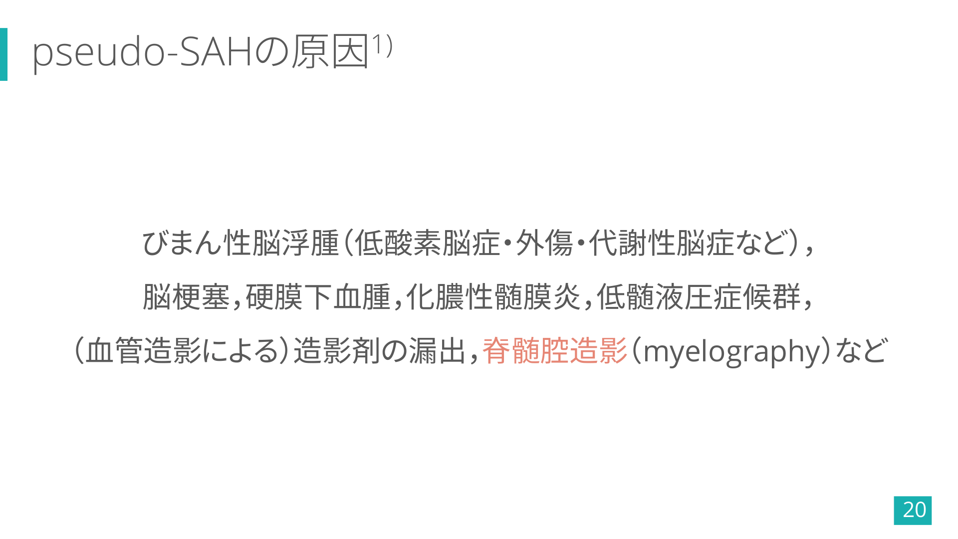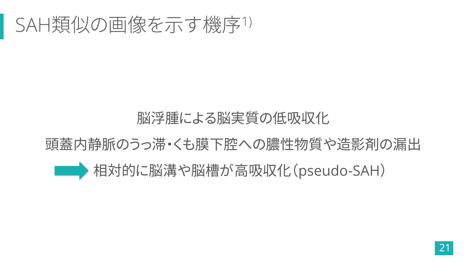 1) pseudo-SAHの原因 びまん性脳浮腫(低酸素脳症・外傷・代謝性脳症など), 脳梗塞,硬膜下血腫,化膿性髄膜炎,低髄液圧症候群, (血管造影による)造影剤の漏出,脊髄腔造影(myelography)など 20 #21.
