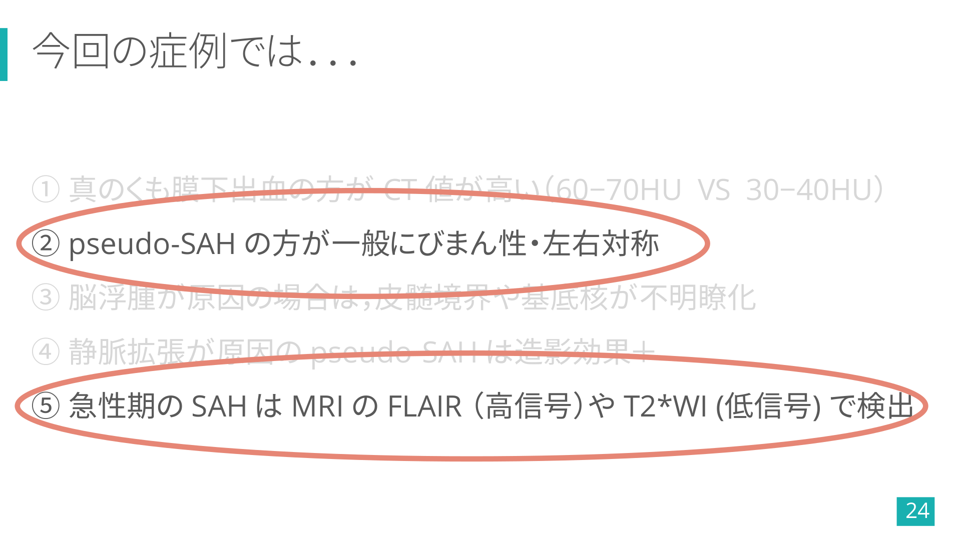 SAH と pseudo-SAH 2,3,4) の鑑別 ① 真のくも膜下出血の方が CT 値が高い(60−70HU VS 30−40HU) ② pseudo-SAH の方が一般にびまん性・左右対称 ③ 脳浮腫が原因の場合は,皮髄境界や基底核が不明瞭化 ④ 静脈拡張が原因の pseudo-SAH は造影効果+ ⑤ 急性期の SAH は MRI の FLAIR (高信号)や T2*WI (低信号) で検出 23 #24.