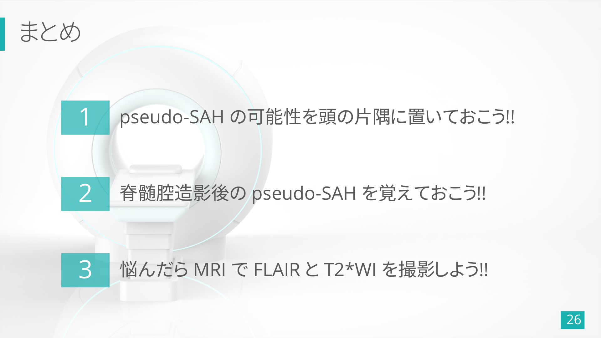 まとめ 1 pseudo-SAH の可能性を頭の片隅に置いておこう!! 2 脊髄腔造影後の pseudo-SAH を覚えておこう!! 3 悩んだら MRI で FLAIR と T2*WI を撮影しよう!! 26 参考文献とプレゼンターの紹介 #27.